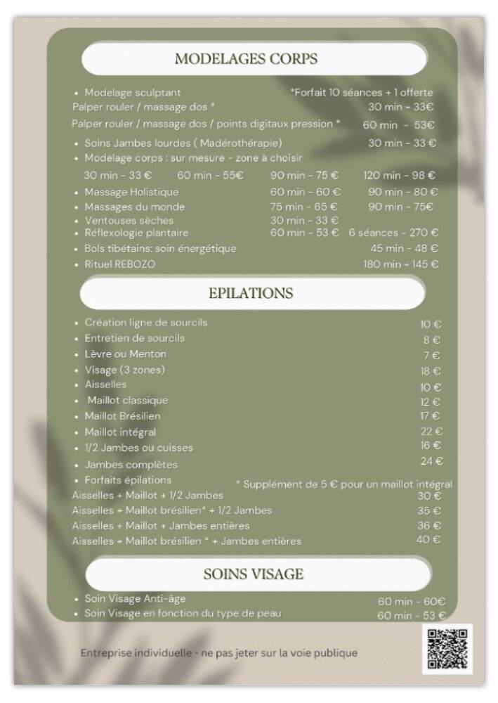 A partir du 8 Septembre 2025, un changement tarifaire sera effectué sur l’ensemble des prestations, je vous invite à en prendre connaissance